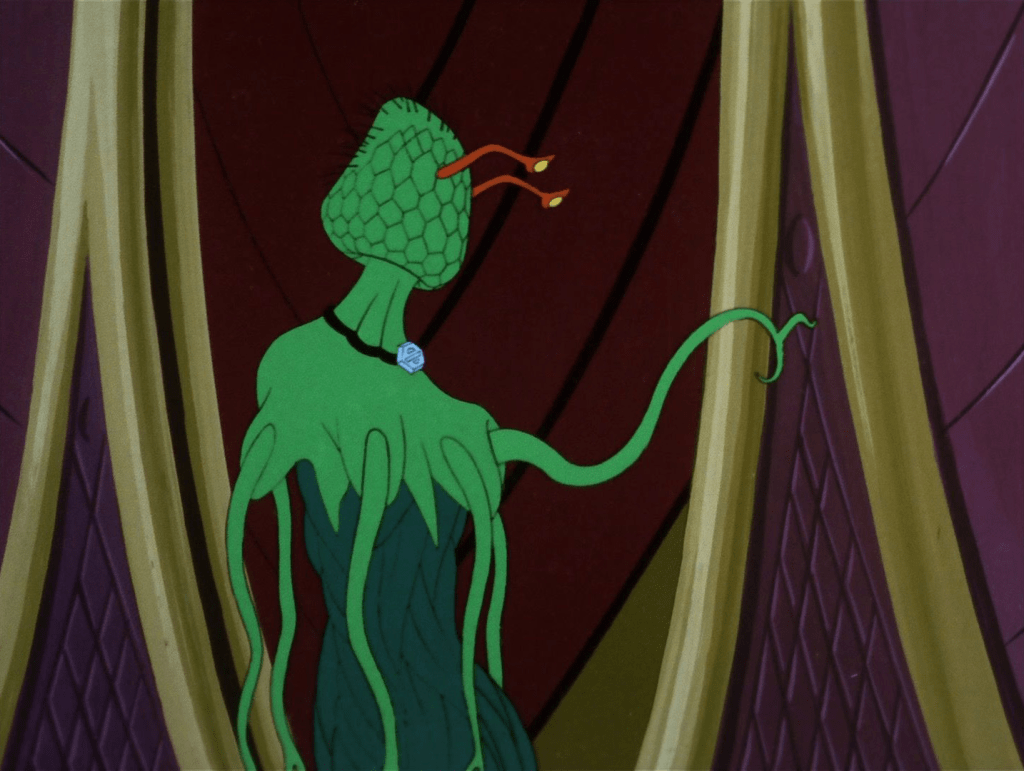Plants rarely make an appearance in Sci-Fi shows, and even less so as walking, talking intelligent lifeforms. With the Animated Series’s increased ability to explore new alien designs, Kirk and crew were able to meet a civilization of four-legged plant beings. Hoping to colonize the planet Phylos for the Federation, the Enterprise crew stumble upon a struggling but highly sophisticated society of plant people. Lieutenant Sulu is bitten by a walking plant creature, and the native Phylosians are able to neutralize the toxin and save his life. They appear amicable and welcoming, but it is revealed that their people were wiped out by a foreign disease introduced by the genetically altered human, Dr. Stavos Keniclius. The aging Dr. Keniclius has been cloning himself, and transferring his consciousness into the new clone bodies, for years, thereby making himself immortal. He believes the galaxy is still a war-torn hellscape and he intends to team up with the Phylosians to impose a new peace upon everyone. With his current clone body wearing out, he creates a giant Spock to carry out his plans.